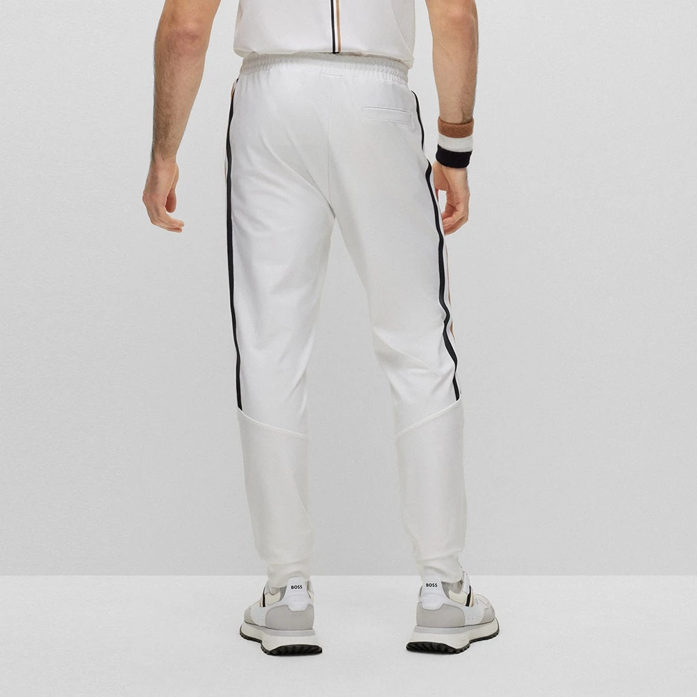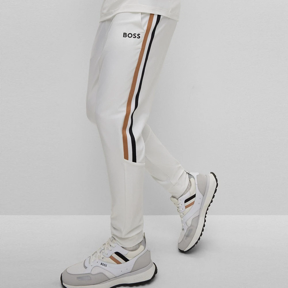 These brand new BOSS sweatpants come from the limited edition Matteo Berrettini capsule and look ultra sporty in this iconic colour combination. The contrast logo couples well with the tri-colour stripe detailing at the outside legs, while the sporty look is rounded off perfectly by the cuffed ankles. The fabric is soft, stretchy & technical – providing both comfort & performance through the moisture wicking capabilities. Look out for the matching Sicon MB 1 full zip hoodie to complete the co-ord look this season.