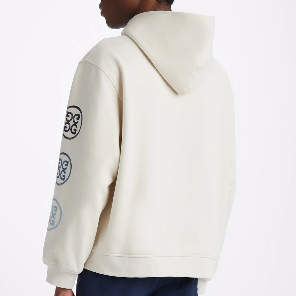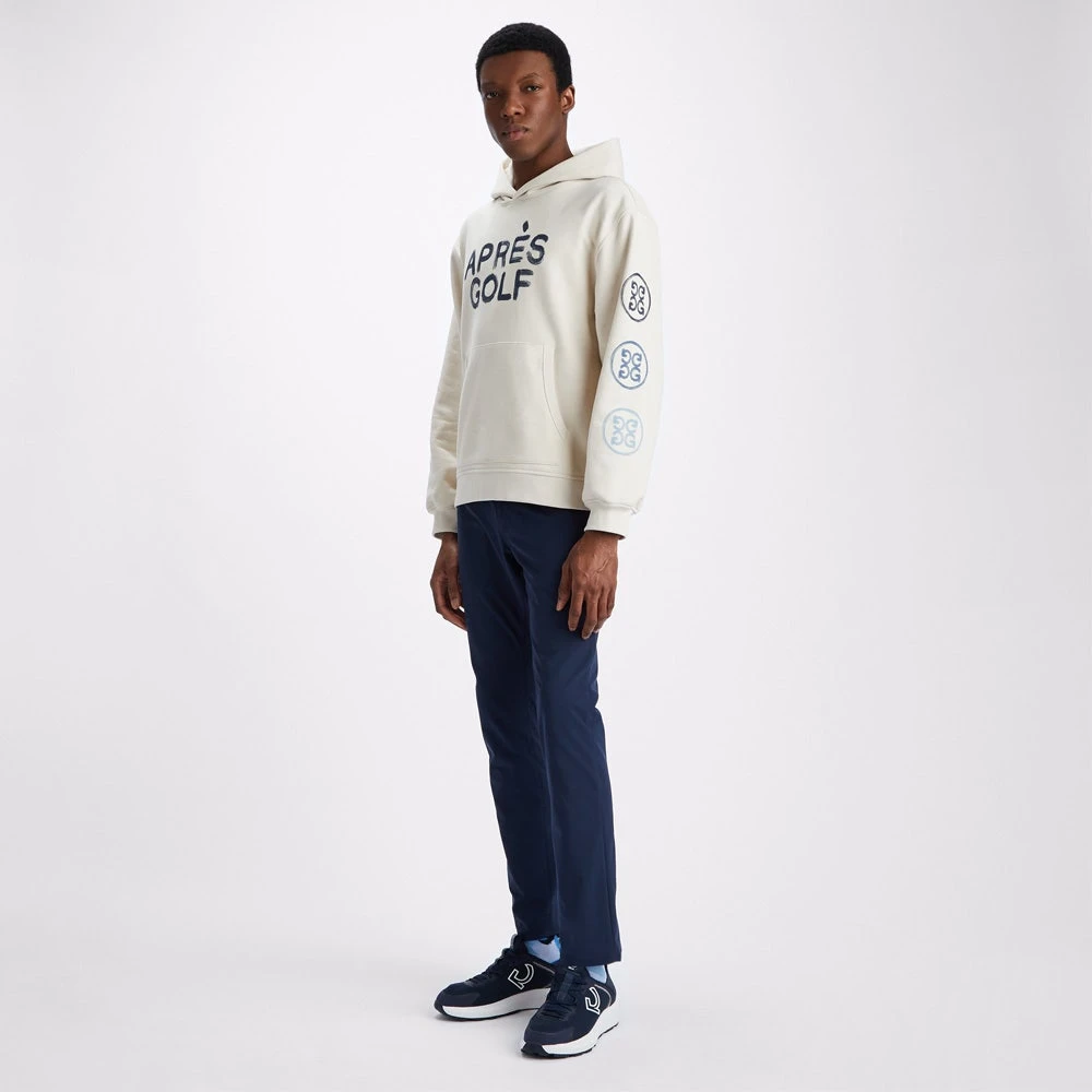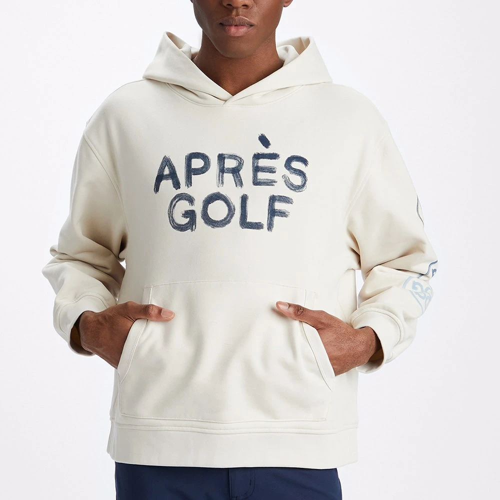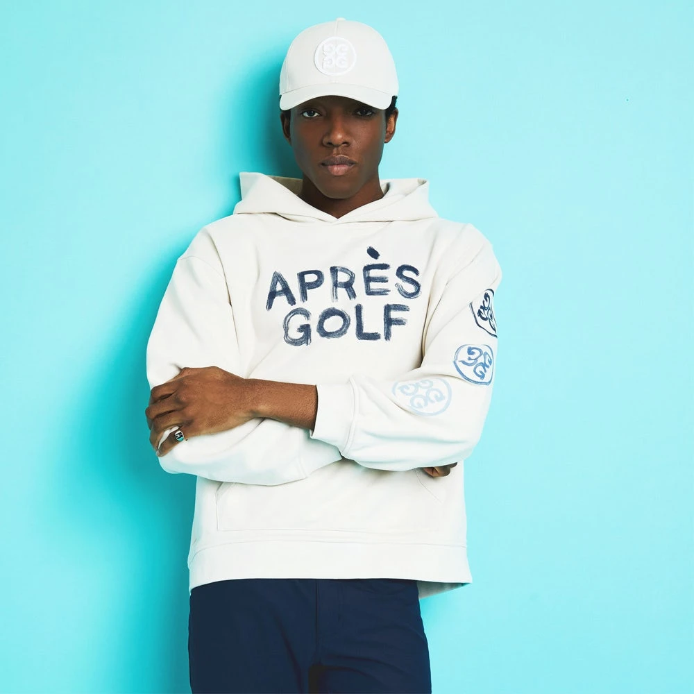 Inject some street wear inspired styling into your game on and off the golf course with this mid layer hoodie from G/FORE. It’s a trending style which makes use of a technical cotton fabrication, hence providing a lifestyle look & feel while retaining the all important moisture wicking properties and a brushed interior for added warmth. It features an enlarged “Après Golf” text graphic on the front, while a trio of enlarged Circle G’s logos is also located on the left sleeve. The oversized silhouette & kangaroo pocket further brings a casual streetwear edge, complete with soft rib knit cuffs & hemline for a relaxed look.