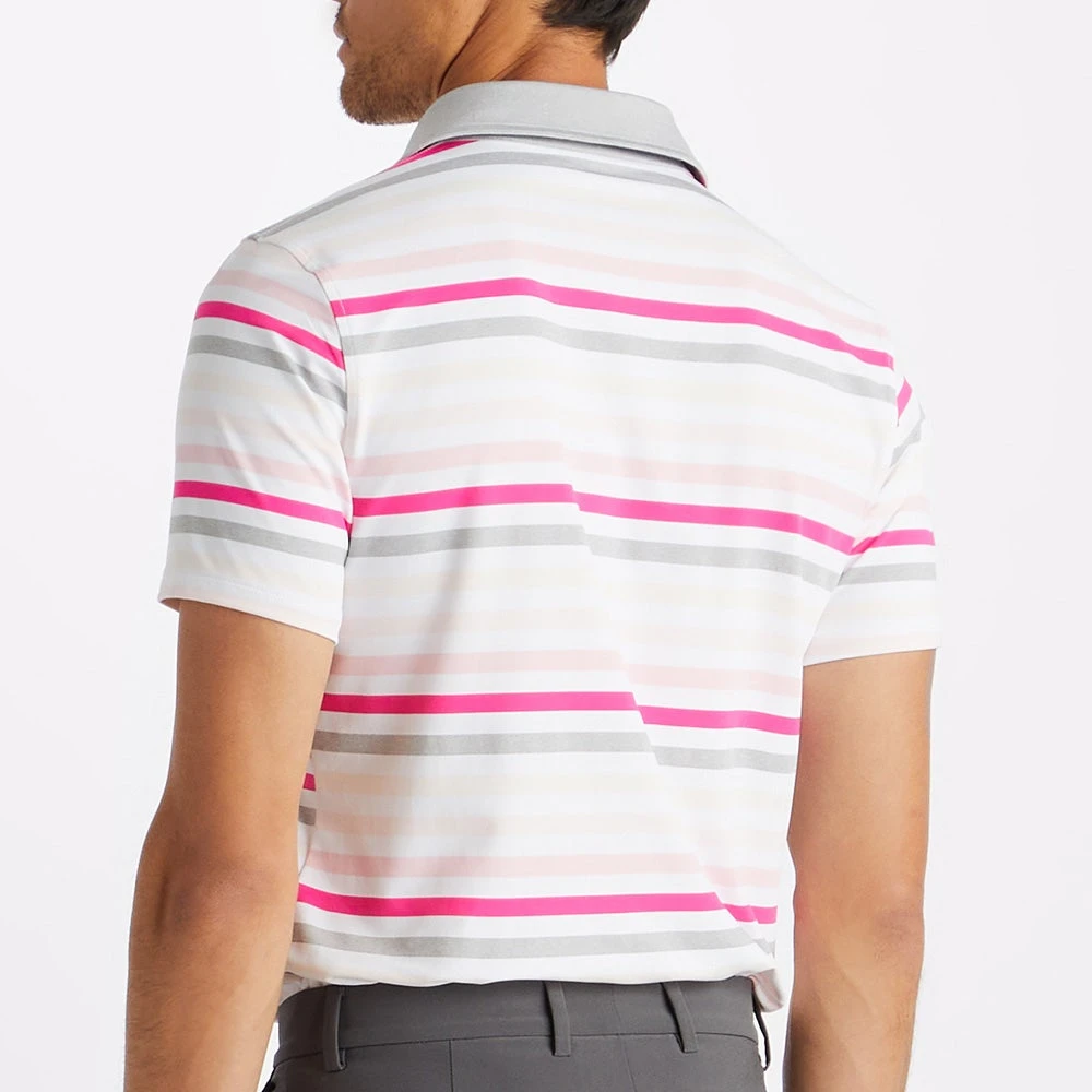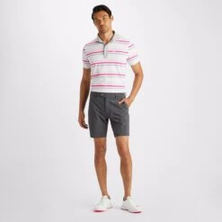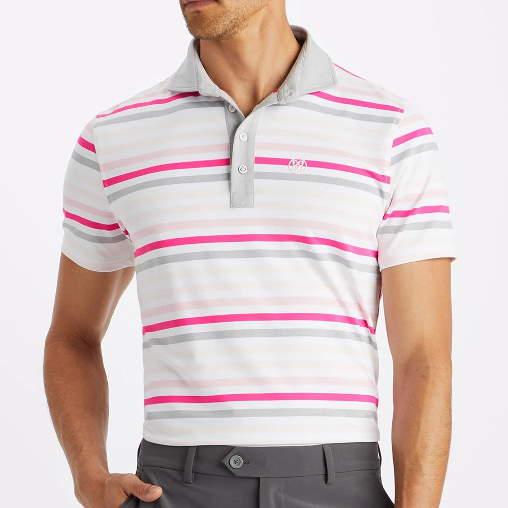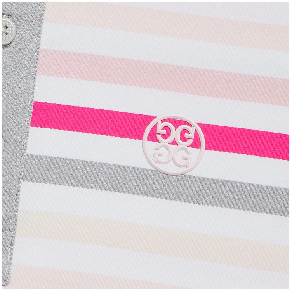 Stand out on the golf course with this super fresh “Favourite Stripe” polo shirt which has arrived from the G/FORE FA23 collection – finished with a multi coloured YD stripe print. The design is further brought to life with the introduction of the chest logo & a contrast placket/collar design – both rounding off a seriously stylish look this season. The soft jersey fabric features a high degree of stretch for maximum comfort in performance, while the moisture wicking nature of the fibres will leave you feeling cool and dry on the inside too. Another outstanding polo shirt from G/FORE which will turn heads for all the right reasons.