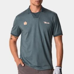 Admiral Sportswear is a brand with over a 100 years of esteemed history & we’re super excited to see them collaborating with one of our favourite golf apparel brands, MACADE. Admiral’s roots are in supplying sportswear to some of the most famous teams in the world & their golf-specific collaboration with Macade draws on historic traits of classic Admiral football kits, reinventing them for the demands of the most modern & fashionable golfers with a sense of nostalgic, mid-century styling inspiration. In particular, this polo shirt is made using a technical fabric with a hint of stripe detailing throughout – complete with knitted V Neck placket & collaborative branding at both sides of the chest. The design throws is back to football kits of the 1970’s, while the unique colour palette helps to make this style stand out from the crowd. One of the best polos from the Macade x Admiral collaboration.