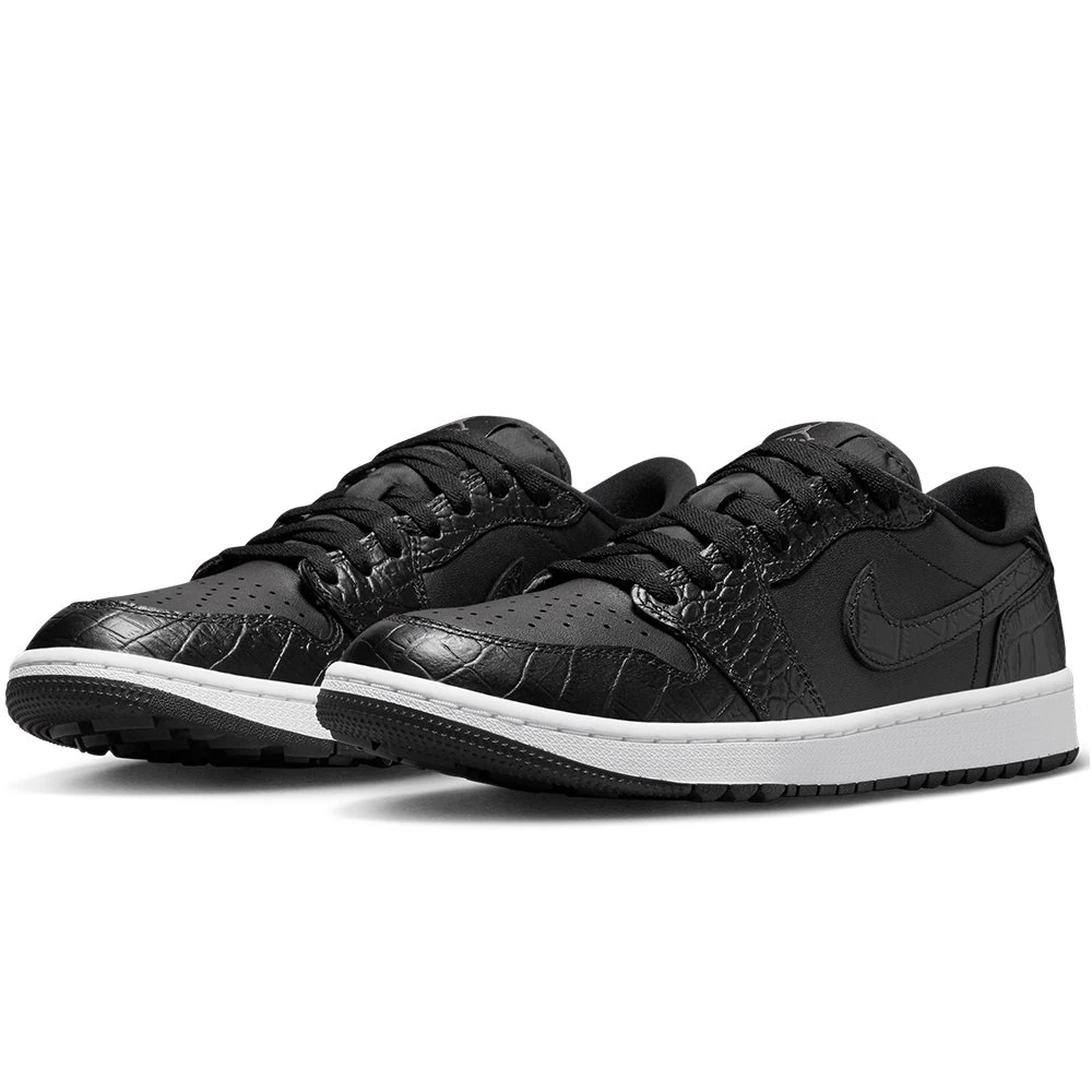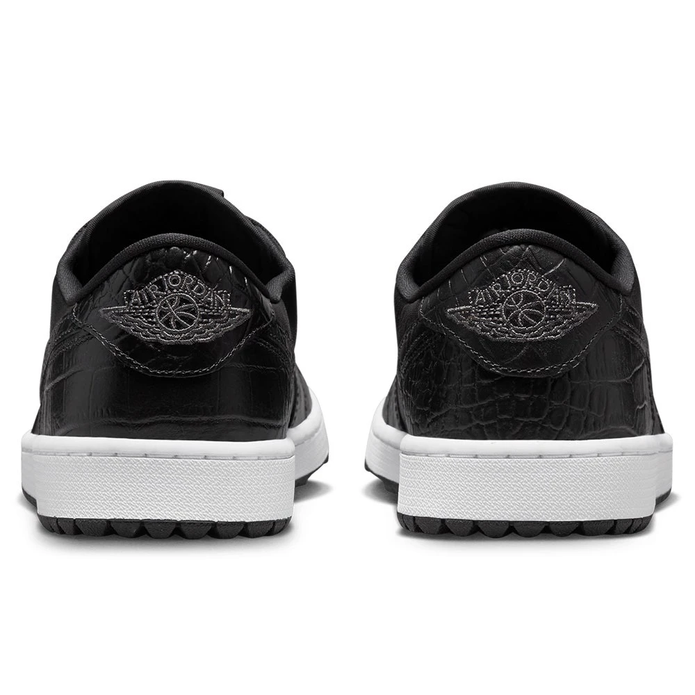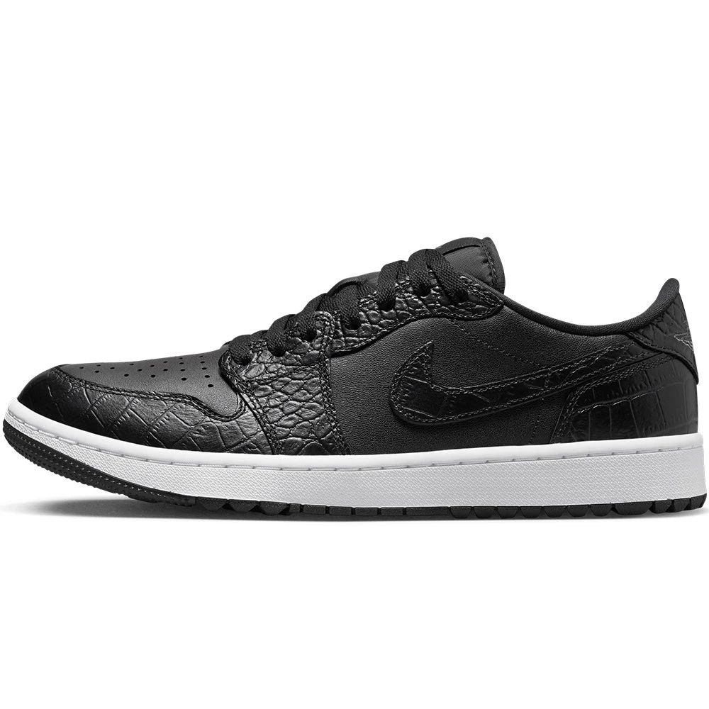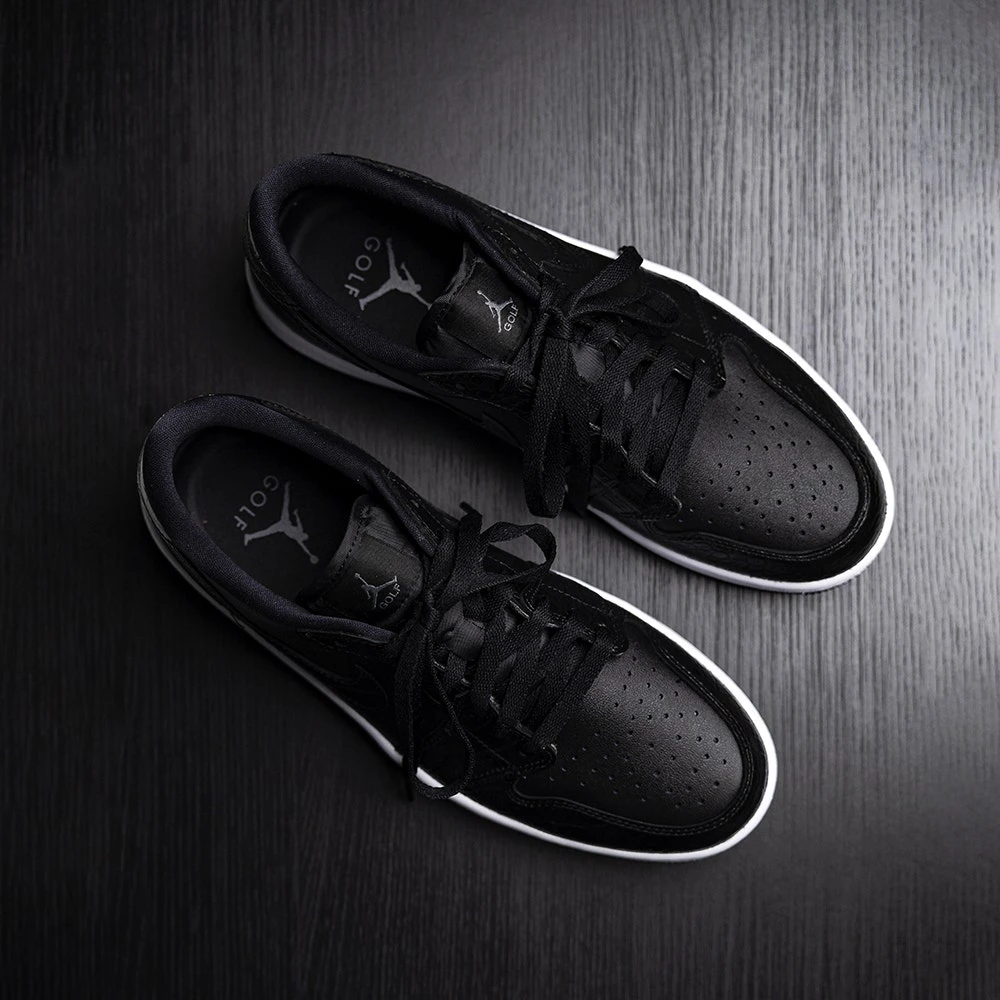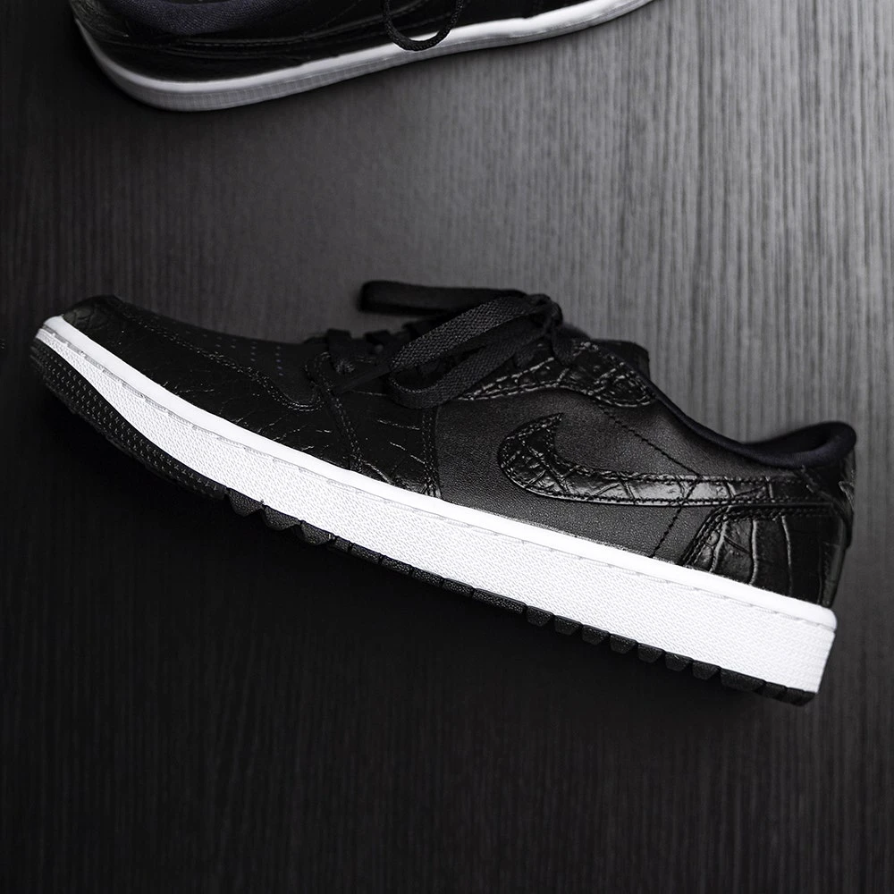 We can finally reveal the Nike Air Jordan 1 golf shoes – a brand new style which is based on one of the true icons of the sneaker world. This golf specific transformation features a “stitch for stitch” reconstruction of the AJ1 upper – meaning that the look, fit & feel remains very much true to the original. That means it also retains some of the legendary design details which make it so identifiable, such as the genuine leather upper, colour blocked aesthetic & Nike Air Jordan branding. Golf specific updates come in the form of a one year waterproof warranty & encapsulated Air at the heels – but the outsole is where you really notice the “G” treatment. For the first time ever, Nike Golf have utilised a spikeless outsole with an integrated traction pattern – perfectly balanced for wearing both on and off the golf course. That’s just one of the many factors which makes the Nike Air Jordan 1 golf shoes the must have shoe style of the year – newly updated with textured “croc” overlays for added style appeal.