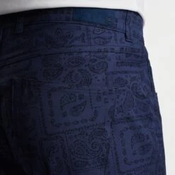 We love to wear Peter Millar golf trousers on the course thanks to the super lightweight, soft and stretchy nature of the technical twill fabrication. The technical, moisture wicking properties of the fabric allows for comfort on the inside regardless of the conditions, while the tailored fit silhouette and newly introduced 5 pocket silhouette is sure to provide a fashionable look this season. Newly refreshed with an all over “Delos Paisley” print pattern.
