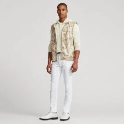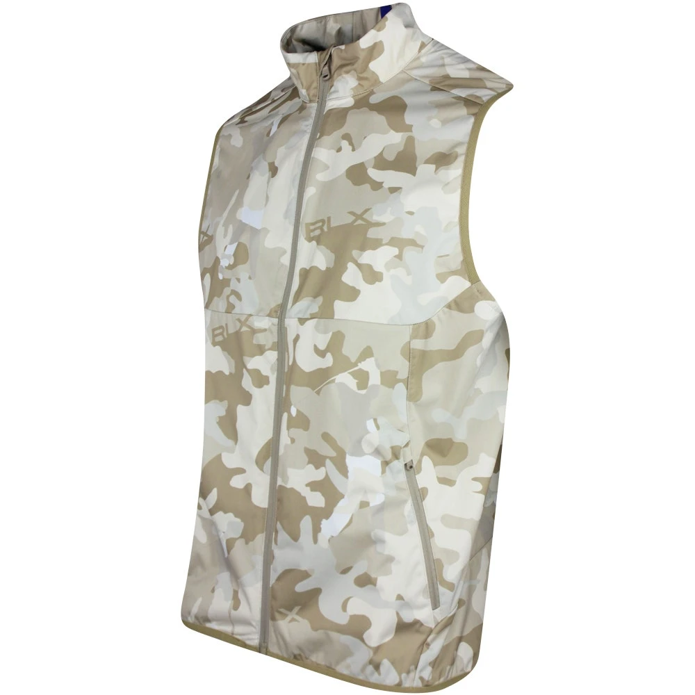 We love the look of this brand new wind vest which comes from the new RLX performance line by Ralph Lauren. It makes great use of a 2.5 layer shell with a high degree of stretch for maximum freedom of movement, while the full zip gilet silhouette is both sporty and functional for ease of on and off. RLX branding is featured at the shoulder, while the all over “Player Camo” print elevates the fashionable look once more. The soft shell finish on the fabric will repel a light rain shower, while the two front pockets are in a handy place for storage. An ideal lightweight option for laying your outfit in the cooler mornings and evenings, effortlessly stowing away in your golf bag when you don’t require the added protection.